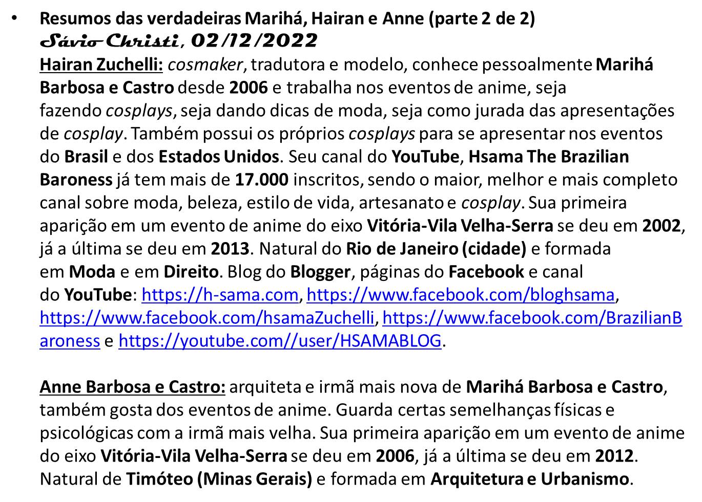 Baseadas em: Marihá Barbosa e Castro, Hairan Zuchelli e Anne Barbosa e Castro, do mundo real e dos eventos de anime, daqui, de Vitória, Espírito Santo. Direitos de nomes gentilmente cedidos para esses livros.